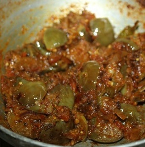 * Add water and cook till the raw smell leaves and add the cubed brinjal to it. Cover and cook.